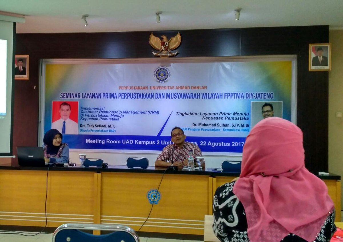Seminar yang dibawakan oleh Dr. Muhammad Sulhan,SIP.,M.Si. dan Drs, Tedi S.,M.T. cukup menarik, dan sangan cocok untuk profesi pustakawan. Agar pustakawan tidak dianggap lagi sebagai penjaga buku, ataupun penjaga rak, peningkatan layanan prima memang harus diaplikasikan oleh setiap pustakawan, dikarenakan pustakawan merupakan penyedia layanan informasi yang menyenangkan. Sehingga seorang pustakawan harus bersikap ramah, ringan tangan dalam membantu kebutuhan pemustaka.